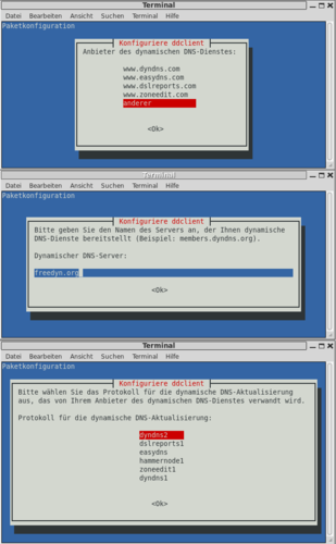 Als Alternative unter Linux bietet sich 'ez-ipupdate' an. Unter Debian oder Ubuntu 'sudo apt-get install ez-ipupdate'. Auch hier als Protokoll 'dyndns' einstellen.