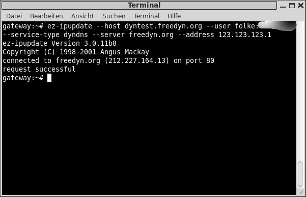 ez-ipupdate --host xxxxx.freedyn.org --user user:pass \ --service-type dyndns --server freedyn.org \ (--address x.x.x.x|--interface ethX)